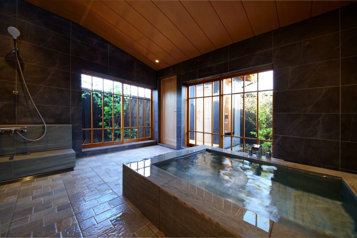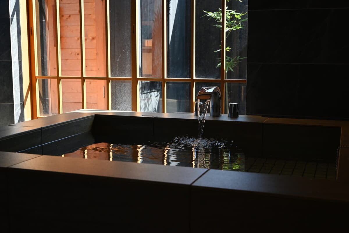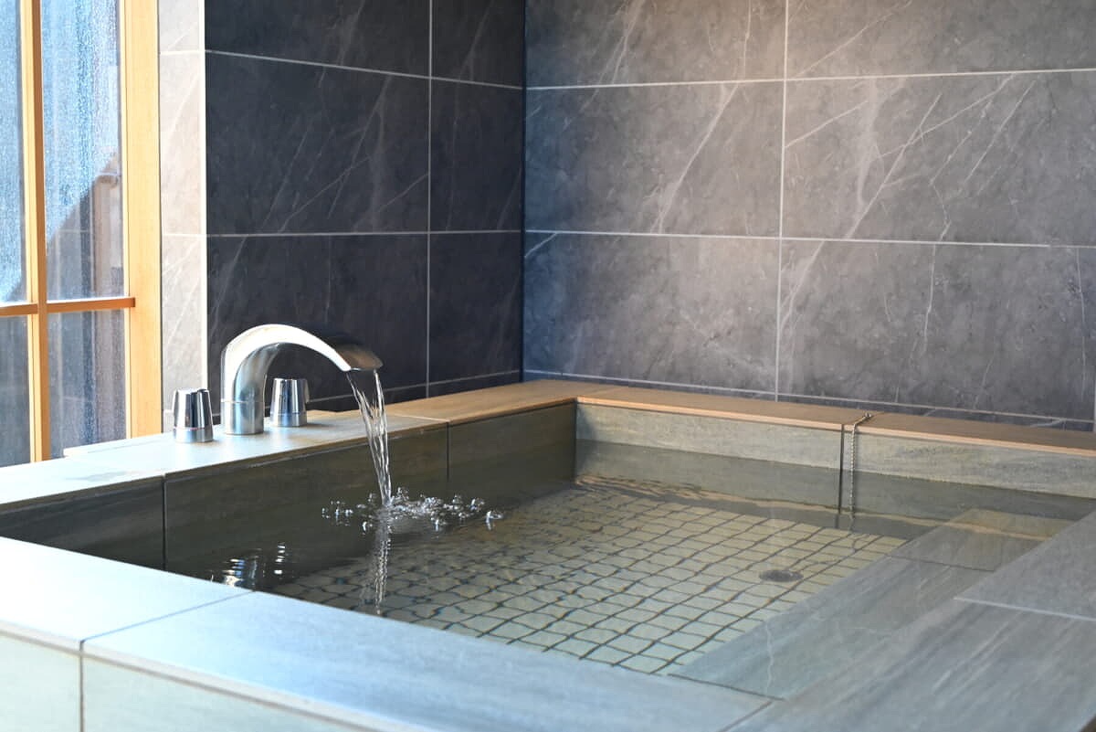天然温泉半露天風呂を完備。お客様毎に入替える「完全換水」でお客様だけの天然温泉を